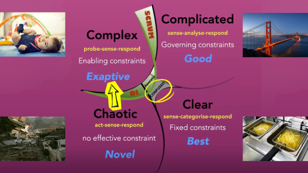 Inspiramo-nos muito no modelo Cynefin, do pesquisador Dave Snowden, que classifica os tipos de problemas em categorias como simples, complicados, complexos e caóticos. Quando estamos diante de algo confuso, como é o caso de muitos projetos sociais e ambientais, não adianta tentar entender tudo antes de agir. Na verdade, a ação vem antes da compreensão.